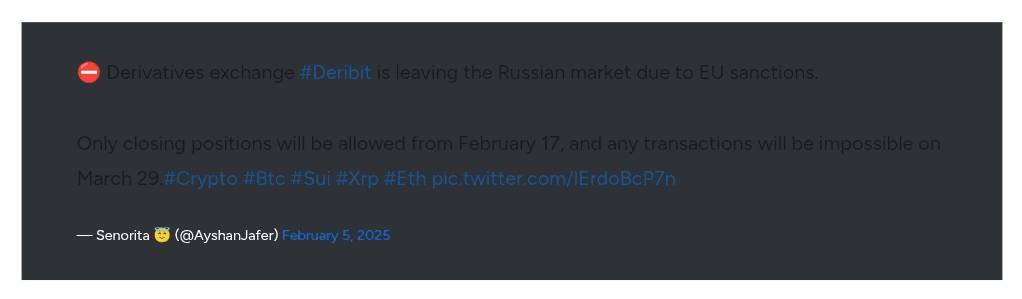 Un e-mail de Deribit aux clients explique que les comptes russes entreront en mode « réduction uniquement » à partir du 17 février 2025, ce qui signifie que les traders ne peuvent que fermer des positions ou passer de nouveaux ordres qui réduisent le risque. Toutes les positions ouvertes seront fermées le 29 mars 2025, mais il n'y aura aucune restriction sur le retrait d'actifs.