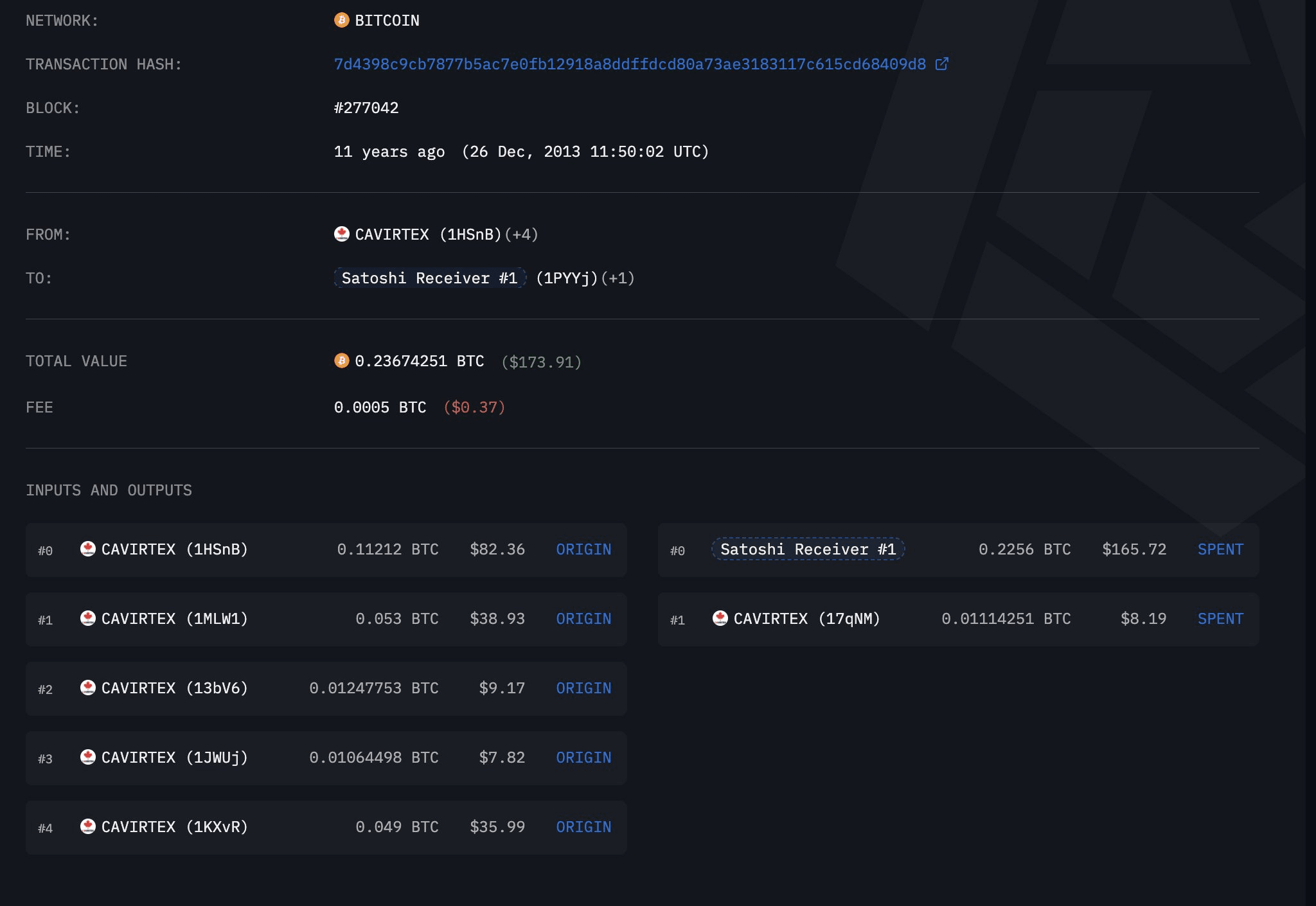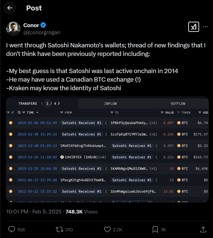 Notamment, cette adresse a été utilisée pour recevoir des Bitcoins de CaVirtEx, un échange basé au Canada. Grogan pense que cela pourrait être la première preuve qu'un portefeuille considéré comme appartenant à Satoshi a déjà échangé avec un échange centralisé (CEX).