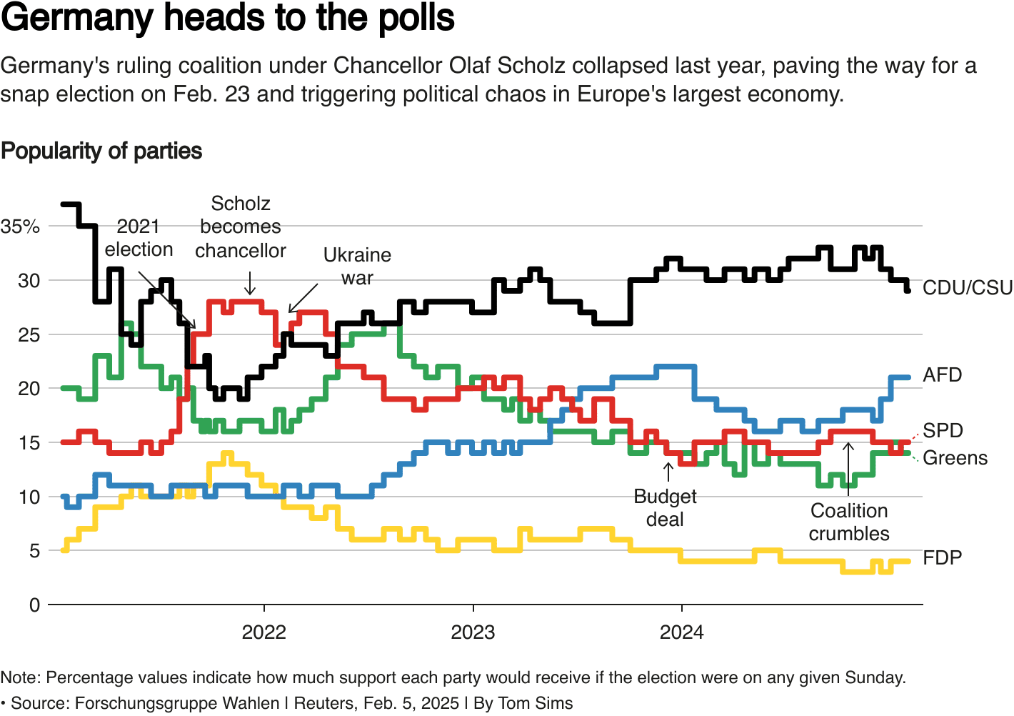 Le parti chrétien-démocrate/union sociale (CDU/CSU) de Friedrich Merz est en tête des sondages, mais ses politiques fiscales sont seulement générales et manquent de détails.