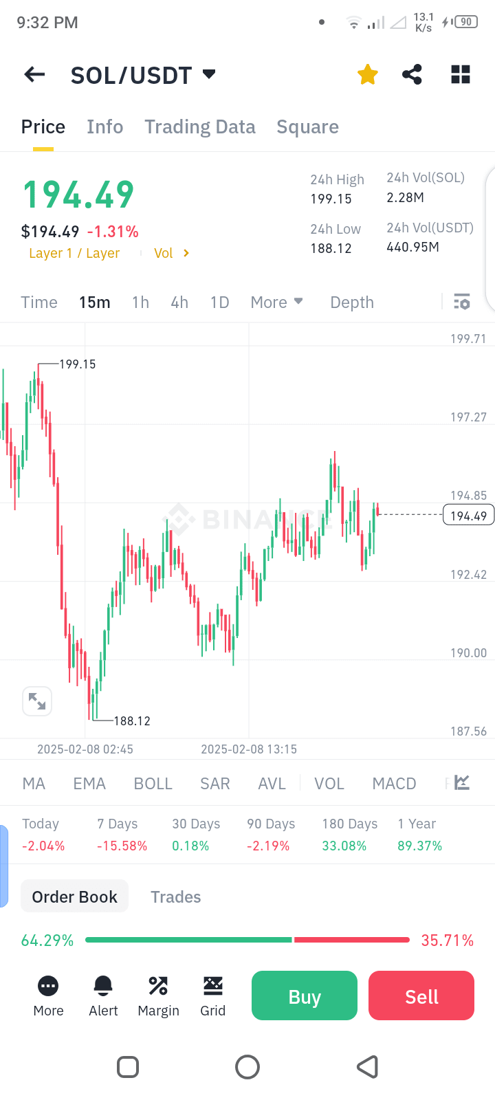 1. Évolution des prix : Le prix actuel de SOL/USDT est de 194,49 $, soit une légère baisse de 1,31 %. Le prix a fluctué dans une fourchette, ce qui indique une consolidation potentielle.