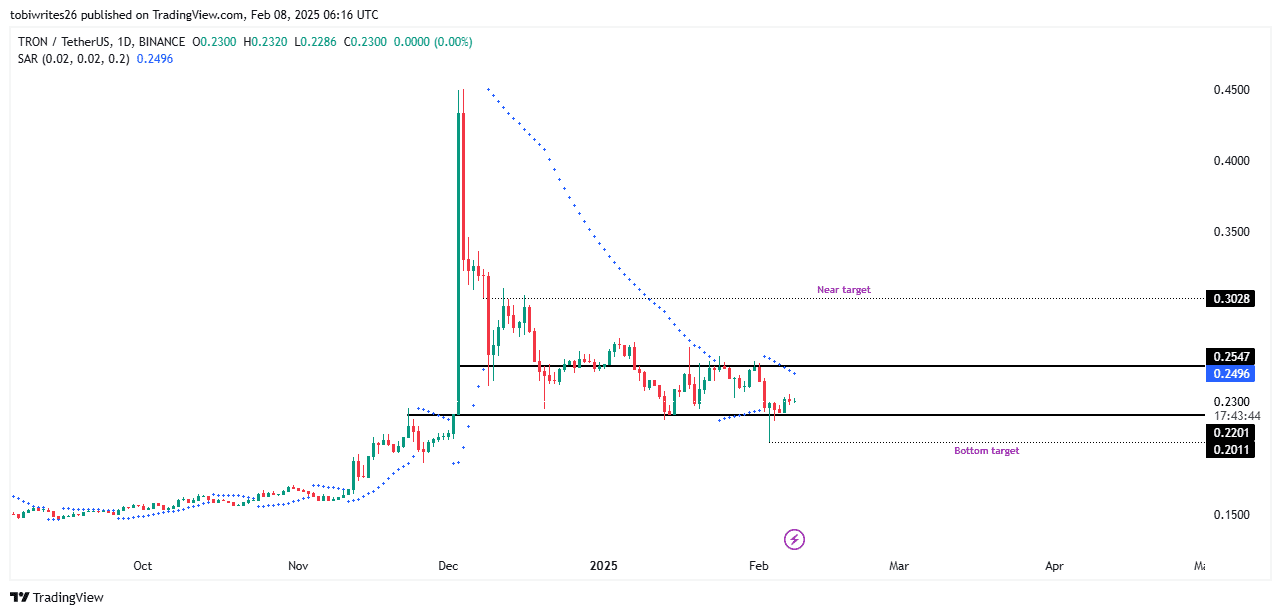 D'un autre côté, si le *sentiment du marché* devient négatif ou si la *création de USDT* ralentit de manière inattendue, *TRX* pourrait subir une *pression à la baisse*, revenant potentiellement au niveau de support de *0.22*. La *volatilité* est courante sur le marché crypto, alors soyez préparé à des fluctuations à court terme.