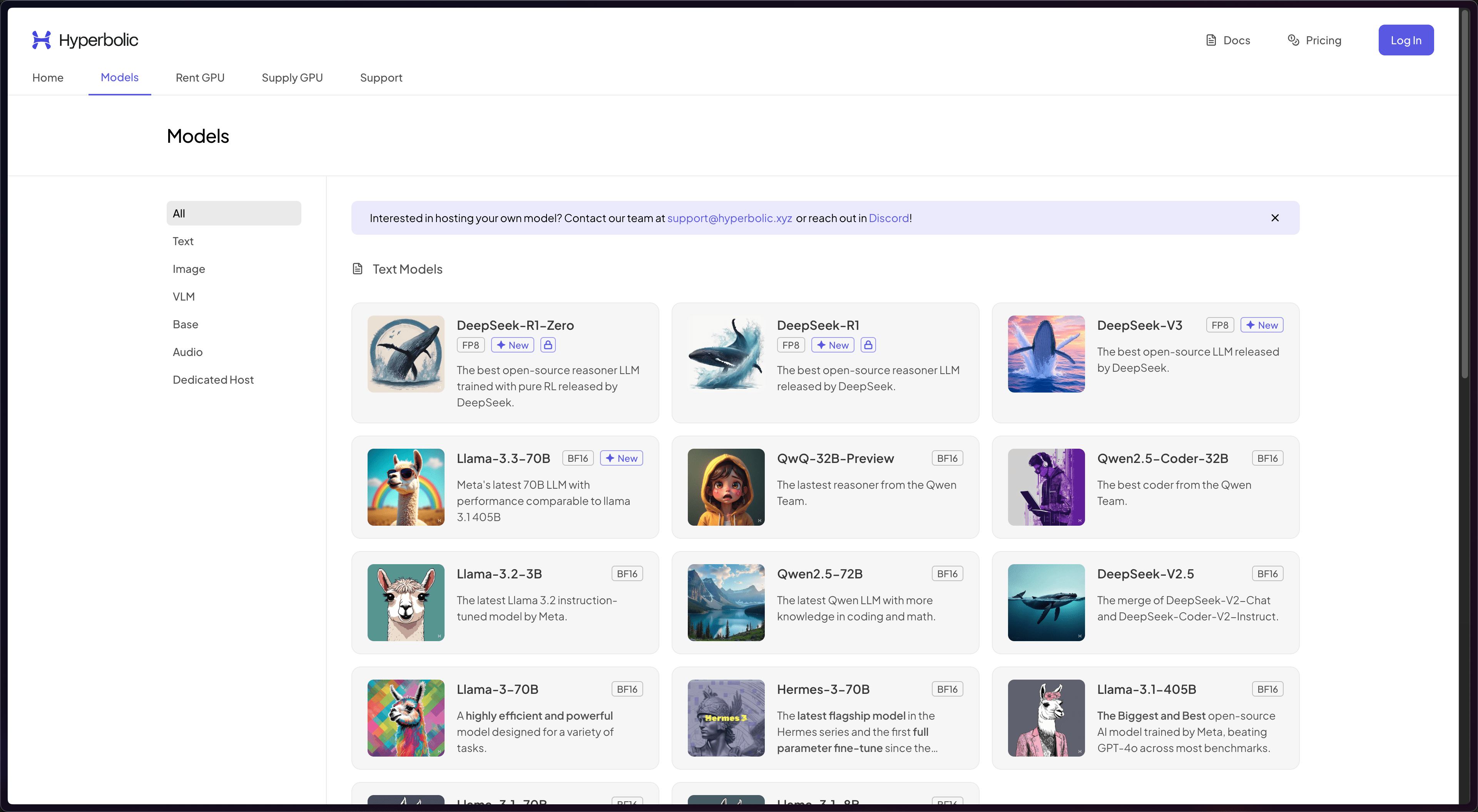 Hyperbolic offre une interface riche de génération de texte et d'image AI, dont le très populaire DeepSeek R1 coûte seulement 2,00 $ / 1M de tokens, ceux qui en ont besoin peuvent vraiment essayer !