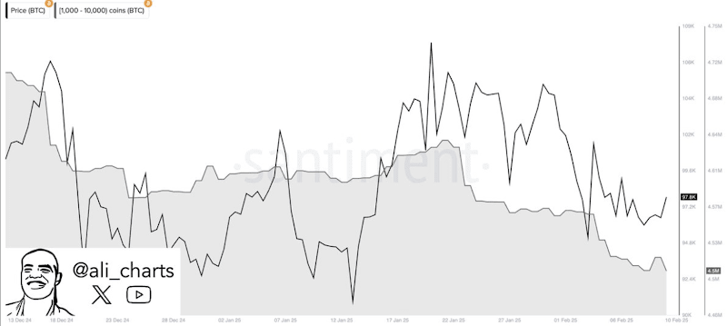 Les données de Santiment montrent un mouvement substantiel des baleines avec plus de 60 000 BTC transférés au cours de la semaine récente. Ce changement de marché consiste en des transactions de portefeuille substantielles qui varient de 1 000 à 10 000 BTC pour chaque transaction.