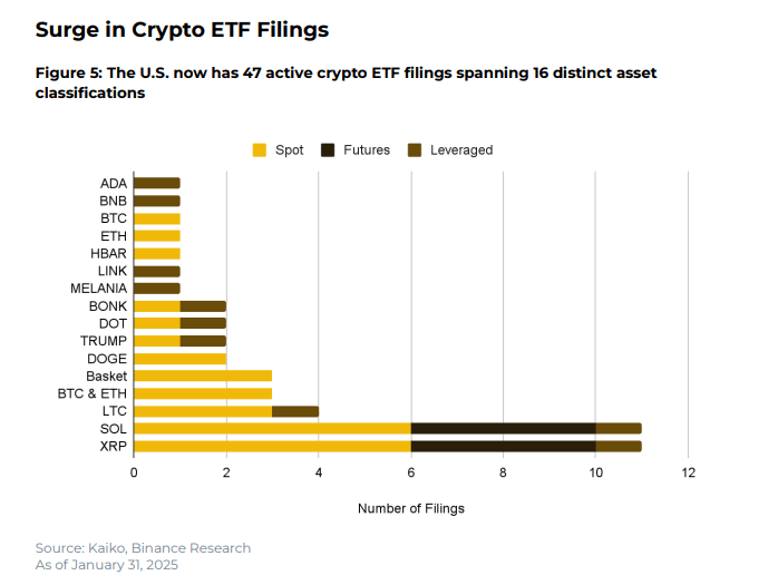 1. Folie des ETF : 47 demandes aux États-Unis, incluant des memecoins et des paniers d'actifs (Fig. 5).