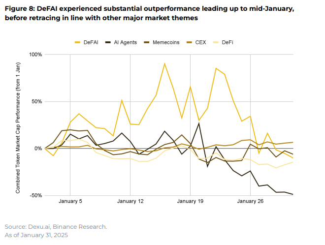 - Le secteur DeFAI (IA décentralisé) a montré une volatilité : +90 % en milieu de janvier, mais -10 % à la fin du mois. Malgré cela, l'IA conserve la tête dans le partage de narration (44 %).