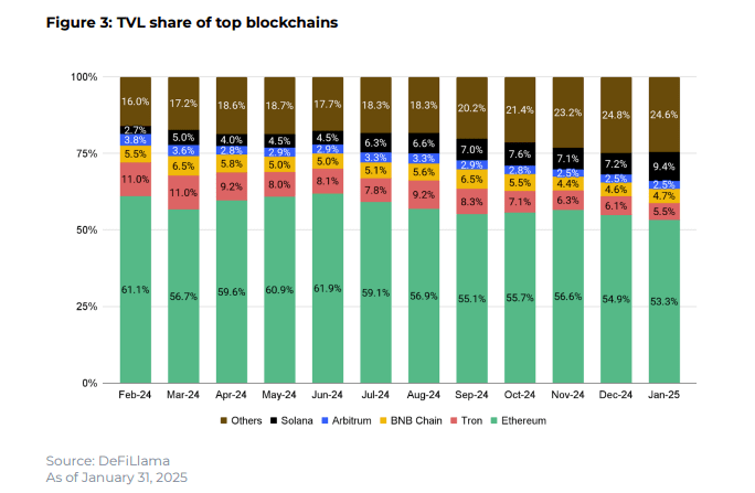 - Les volumes DEX sur Solana en janvier ont dépassé ceux d'Ethereum de 300 % grâce aux memecoins $TRUMP et $MELANIA. Le TVL de Solana a augmenté de 35 %, atteignant 12,1 milliards de dollars.