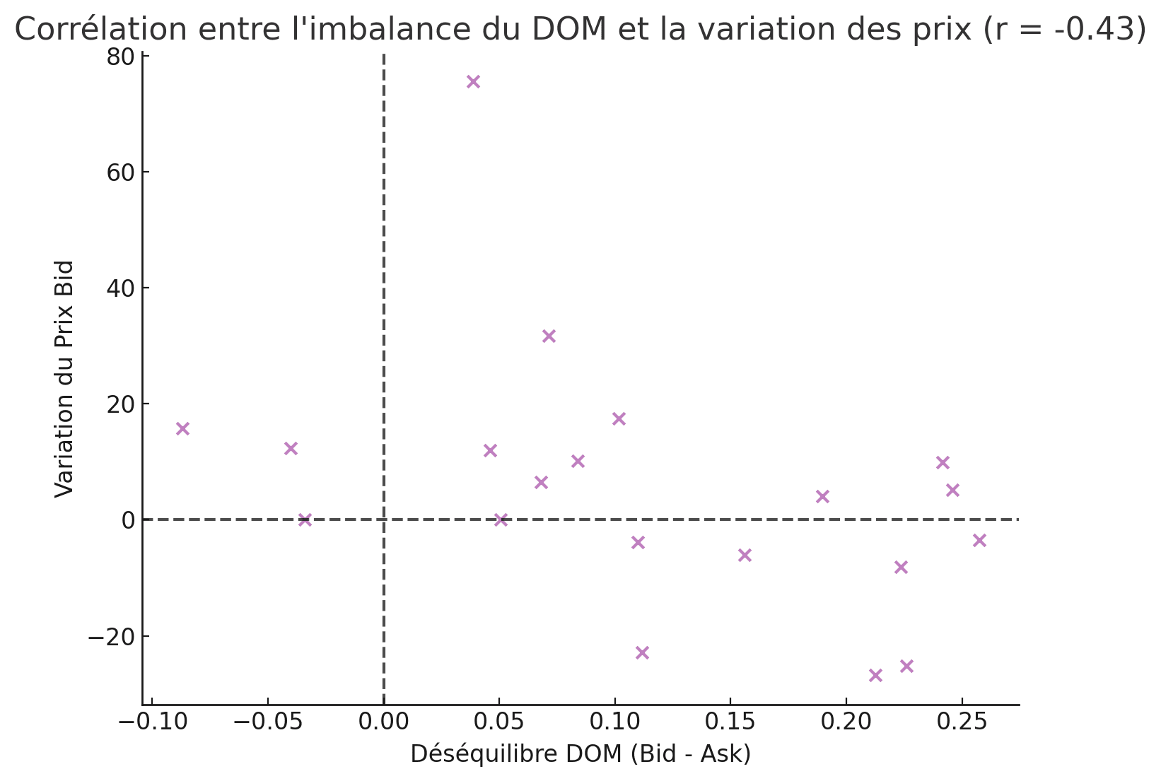 Une corrélation négative signifie que plus le carnet d’ordres est chargé en Bids, plus le prix a tendance à baisser, et inversement.