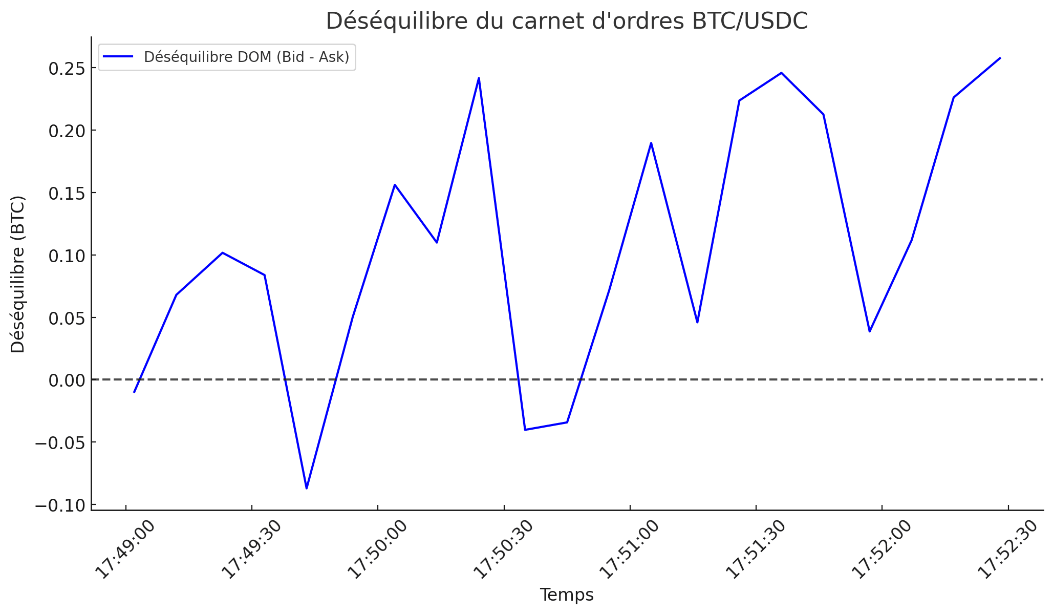 Ce graphique montre clairement comment l’imbalance évolue au fil du temps et donne des indices sur la pression du marché.