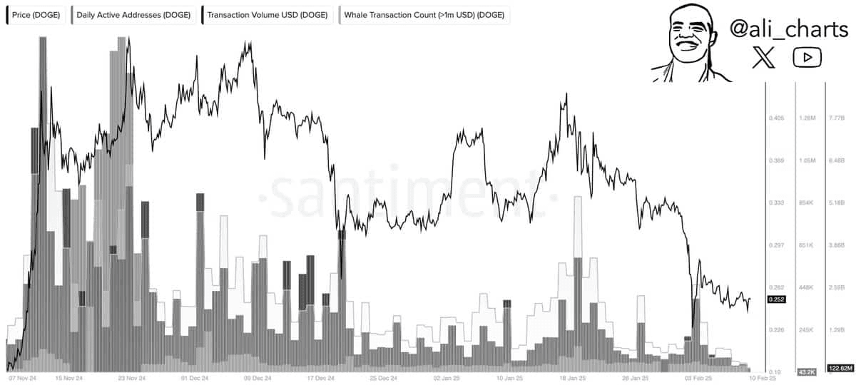 Au moment de la rédaction, DOGE se négociait à 0,252 $, avec de forts volumes de transactions persistant malgré une tendance baissière.