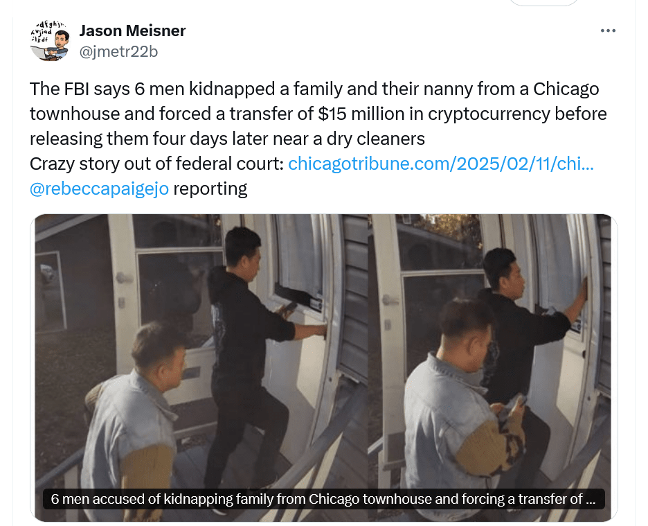 Un enlèvement choquant a eu lieu à Chicago, où six hommes ont enlevé de force une famille de trois membres et leur nourrice, demandant une rançon de 15 millions de dollars en cryptomonnaie.