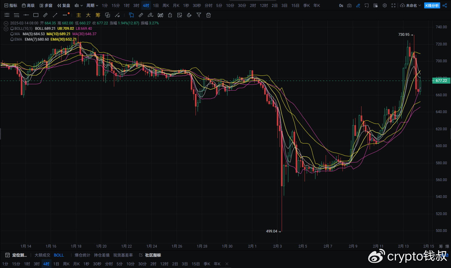 La tendance actuelle de BNB montre une forte dynamique à la hausse, mais il est également nécessaire de rester vigilant face aux risques de correction sur la bande supérieure de Bollinger. Il est conseillé de s'adapter de manière flexible, d'ajuster les stratégies en fonction des fluctuations de prix et de définir raisonnablement les niveaux de support, de résistance et de stop-loss. On s'attend à ce que la plage de prix d'aujourd'hui se situe entre 650,00 et 740,00, en maintenant une pensée de trading flexible et en surveillant les changements de sentiment du marché.