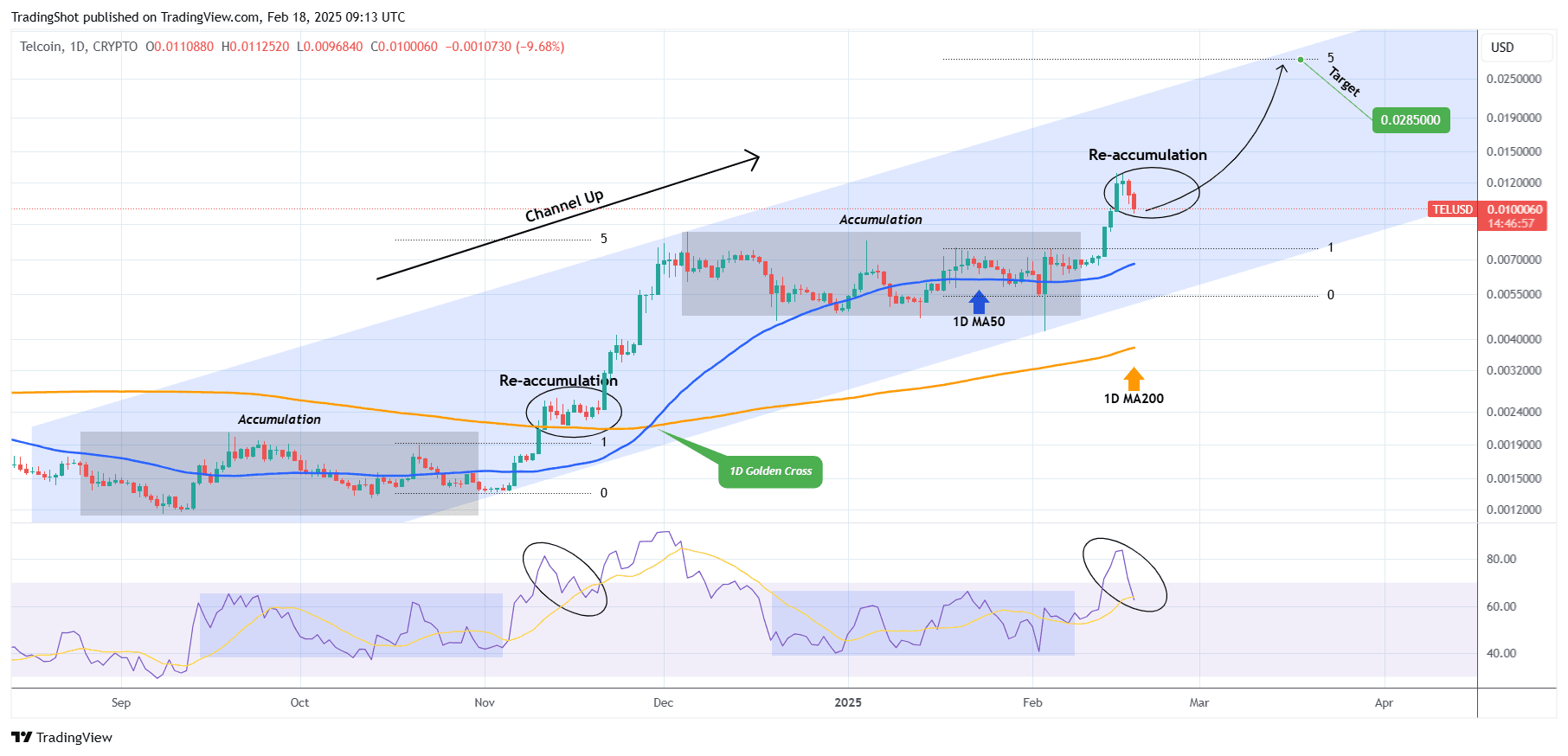 En fait, basé sur la première phase du modèle, c'est la phase de Re-accumulation, qui par le passé a suivi le premier rallye après la phase principale d'accumulation. Tant que la MA50 1D (ligne de tendance bleue) est soutenue, nous nous attendons à ce que TEL reprenne la tendance haussière et, similaire à novembre 2024, complète la jambe haussière sur l'extension de Fibonacci 5.0. Notre objectif est 0.02850.