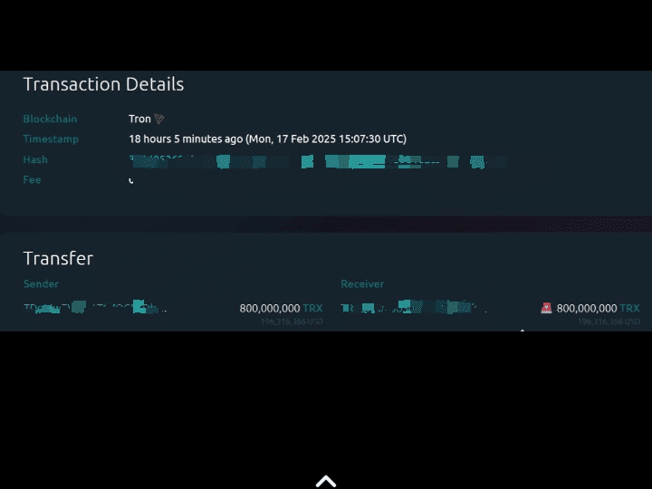 Bonjour à tous ! Une grande nouvelle dans le monde des crypto-monnaies aujourd'hui. Une *énorme transaction* vient d'avoir lieu, avec *800 000 000 TRX* ( *196 358 397 USD*) transférés d'un *portefeuille inconnu* à un autre *portefeuille inconnu*. 🤑💰 Ce mouvement massif de fonds pourrait potentiellement avoir des *implications majeures* pour le *marché TRX*, il est donc temps de *rester vigilant* ! 👀