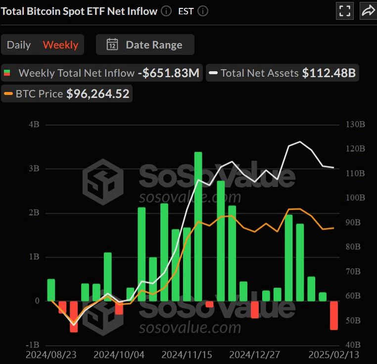 AprĂšs six semaines consĂ©cutives d'entrĂ©es, les ETF Bitcoin de #BlackRock , Fidelity et d'autres ont connu leur deuxiĂšme plus grande sortie hebdomadaire de 651,8 millions de dollars, tandis que le prix du BTC est restĂ© stable. đ