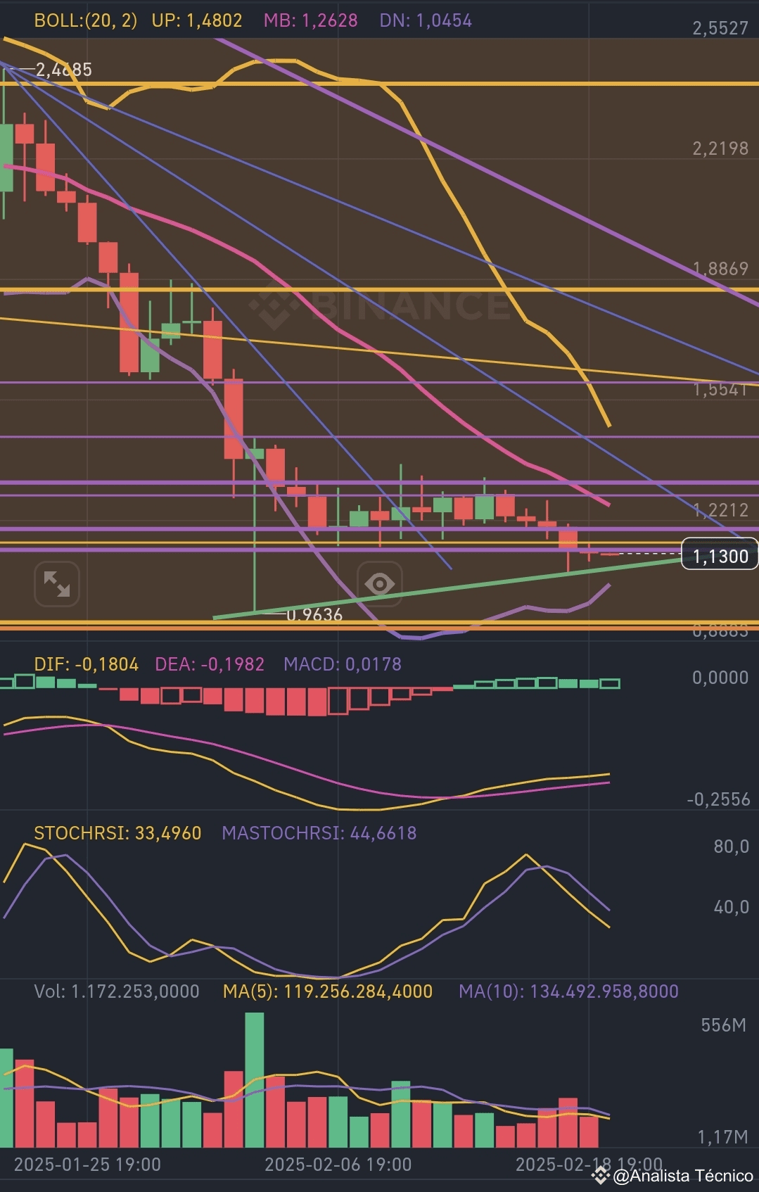 Tendencia bajista en consolidación prolongada: El precio ha estado oscilando entre 1.1300 y 1.2212 dentro de un canal descendente delimitado por las líneas moradas y amarillas.