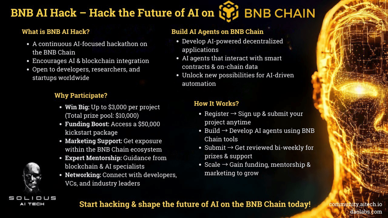 Le #BNBChain est ravi d'annoncer le lancement du BNB #AIHack , un hackathon innovant conçu pour accélérer l'intégration de l'intelligence artificielle (IA) dans l'écosystème blockchain. Cet événement en cours offre aux développeurs, chercheurs et leaders de l'industrie une plateforme unique pour collaborer et repousser les limites de la technologie IA et blockchain.