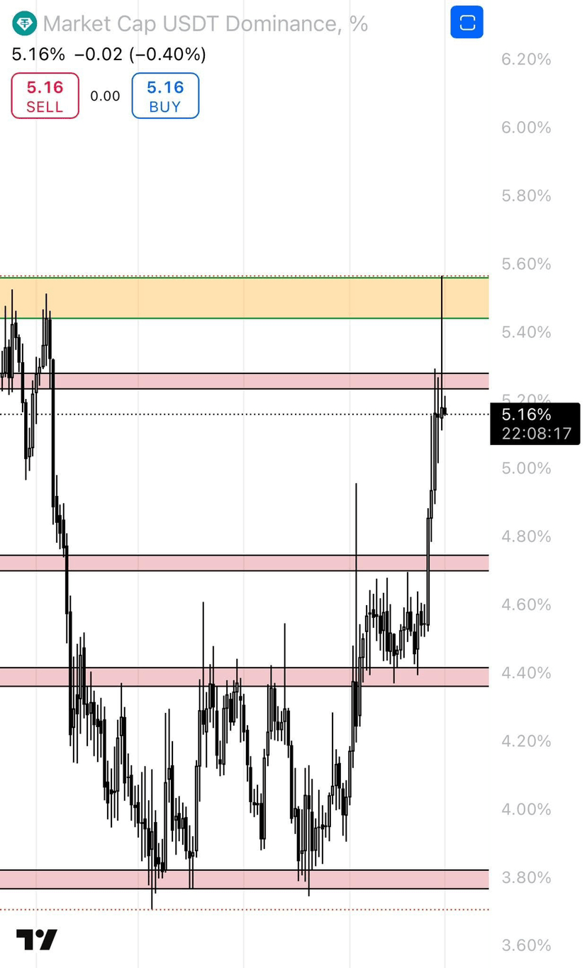 Graphique 2 : La dominance de l'USDT a clôturé comme un marteau baissier avec une énorme mèche vers le haut, rejetant la résistance et montrant une forte pression de vente.