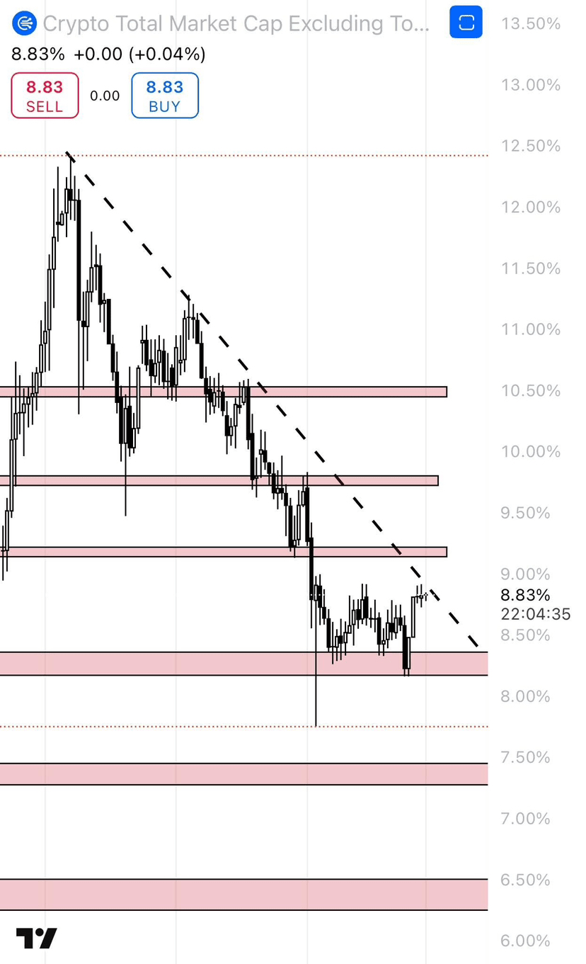 Mais rappelez-vous que pour être haussier sur les Alt, nous devons casser la résistance de 9,18 %, franchir la ligne de tendance baissière, créer un HL puis un HH soutenu par le volume, jusqu'à ce moment-là, ne touchez pas aux Alt à moins que vous ne soyez prêt à prendre le risque avant confirmation.