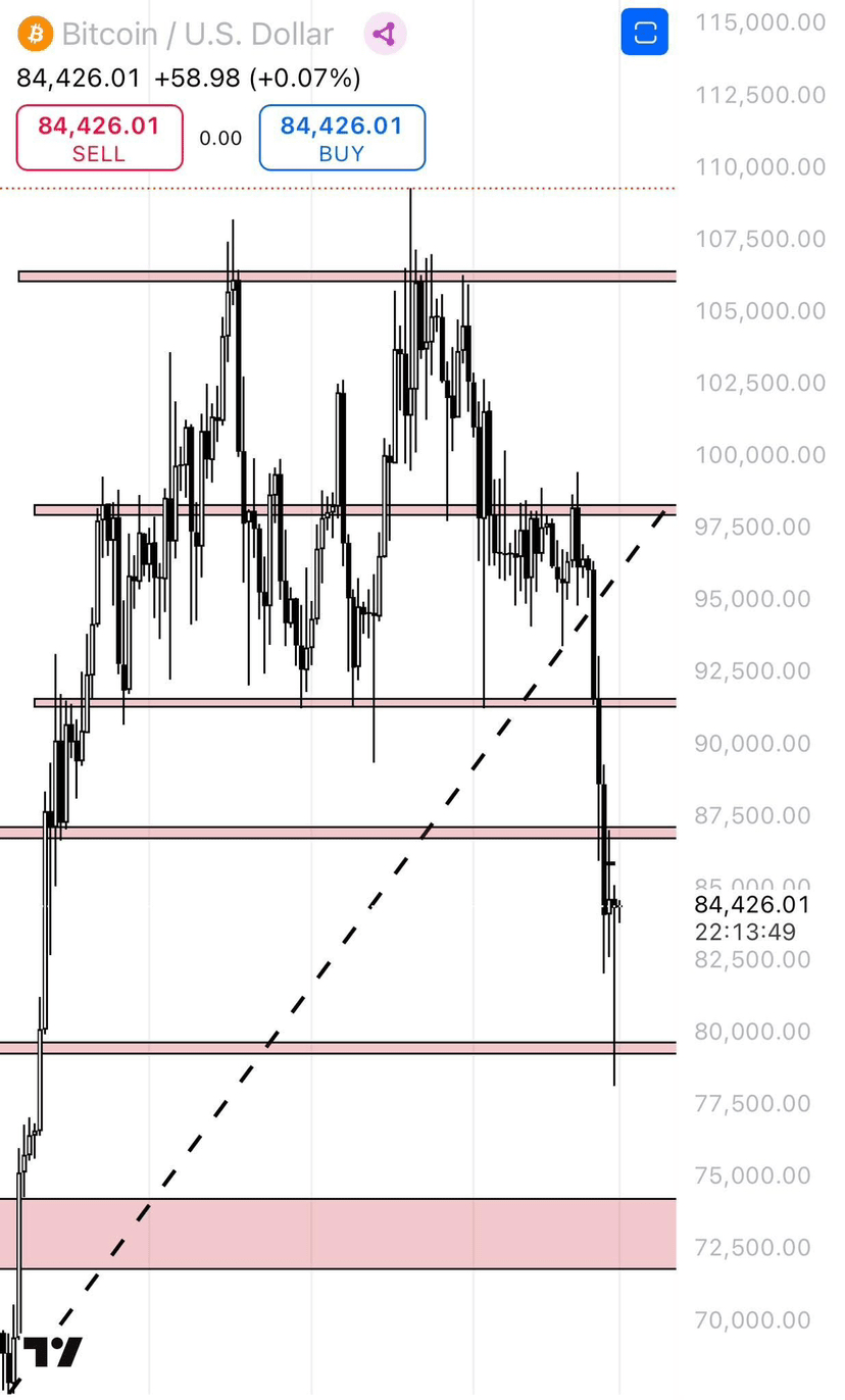 BTC a maintenant changé la structure du marché et nous sommes maintenant dans une tendance baissière. Comme je l'ai dit hier, le seul scénario haussier était que ce n'était qu'un retracement pour la prochaine montée, mais nous devons maintenant rebondir à 79K, qui est notre position actuelle, ou 73K.