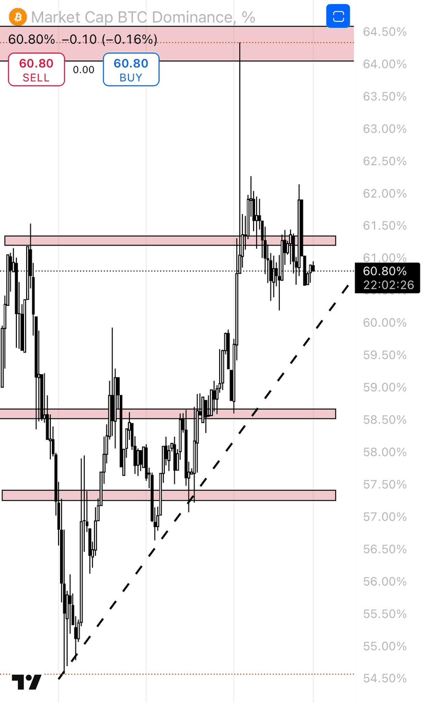 Personnellement, je ne crois pas que ce soit la fin du rallye haussier et qu'il y aura une saison des Alt une fois que BTC.D cassera sa tendance haussière et commencera à chuter comme cela commence à se produire maintenant.