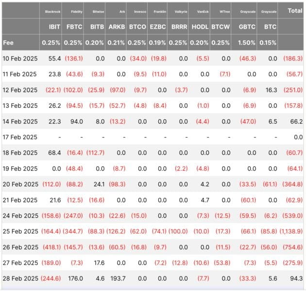 Au cours de la semaine dernière, le BTC est toujours en baisse d'environ 12 %, tandis que le marché de la cryptomonnaie au sens large, mesuré par l'Index 20, a chuté de 15,8 %. Les ETF sur le bitcoin au comptant subissaient une série de sorties significatives depuis le 14 février, un jour où ces fonds avaient enregistré des entrées de 66,2 millions de dollars.