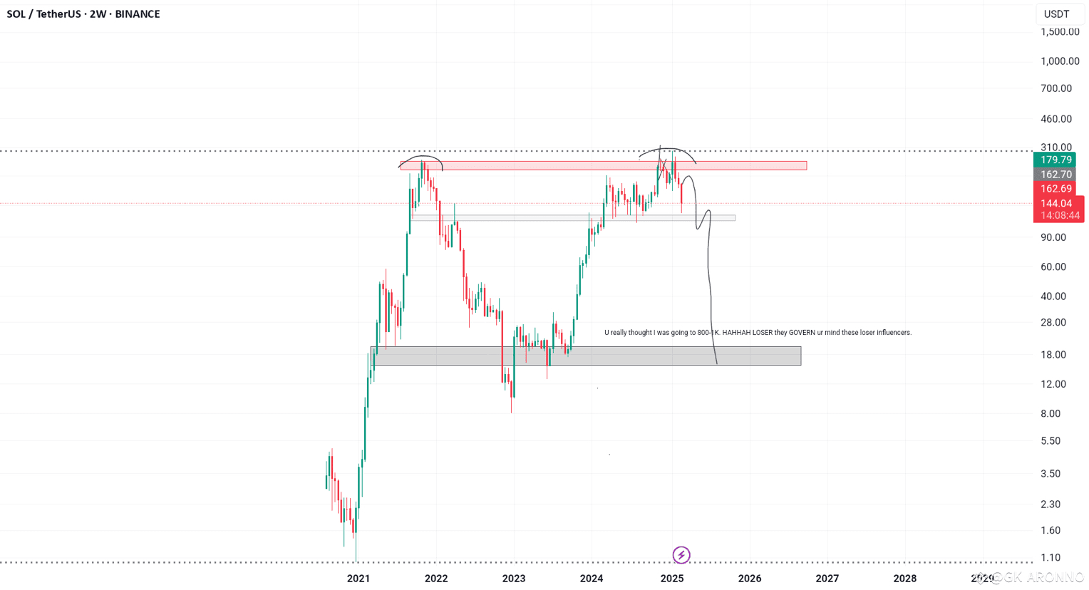 En analysant le graphique macro, on remarque un motif de double sommet suggérant un potentiel balayage de liquidité. Après avoir atteint le support initial et connu un faible rebond, le prix se dirige maintenant vers 120 $. Étant donné les conditions actuelles du marché, il est prévu que Solana tombe à 5-10 $ avant la fin de l'année ou d'ici 2026 au plus tard. Si vous pensez que le graphique atteindra 800-1 000 $, vous vous préparez à une déception. De nombreux influenceurs ne font que promouvoir des attentes irréalistes. Des changements majeurs sont à l'horizon—à bientôt de l'autre côté.
