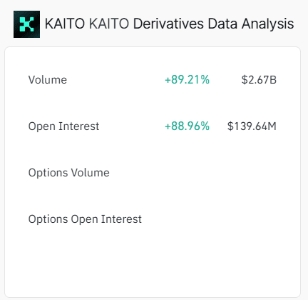 L'intérêt ouvert de Kaito a augmenté de 88,96 % pour atteindre 139,64 millions de dollars, reflétant un intérêt croissant pour l'altcoin.
