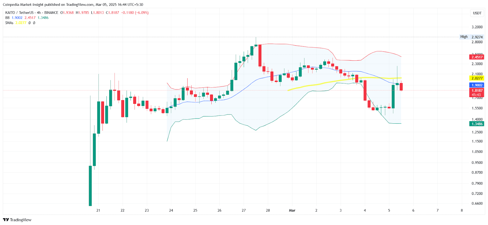 Sur le cadre temporel de 4 heures, KAITO forme un modèle en double creux au niveau de 1,55 $, qui est un modèle de retournement haussier significatif. Le prix a rebondi depuis la zone de support de 1,55 $, suggérant que les haussiers se battent pour défendre des niveaux inférieurs. Néanmoins, l'altcoin a une forte résistance à 2,028 $ indiquée par les indicateurs clés.