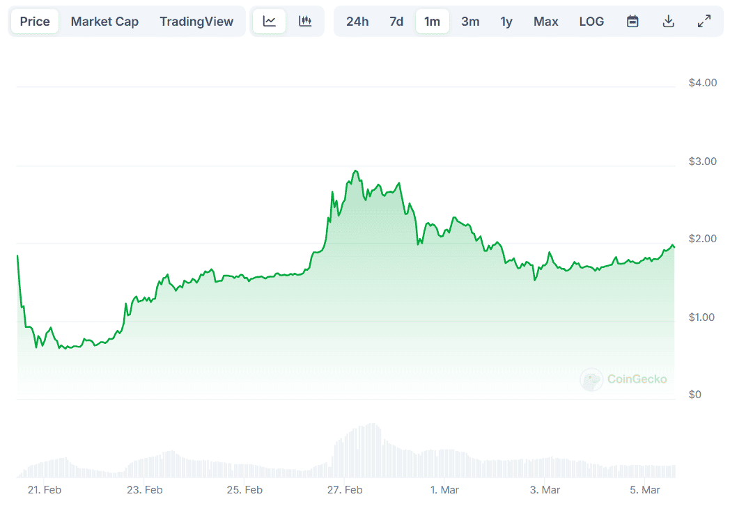 PI a atteint un sommet historique de près de 3 $ le 27 février.
