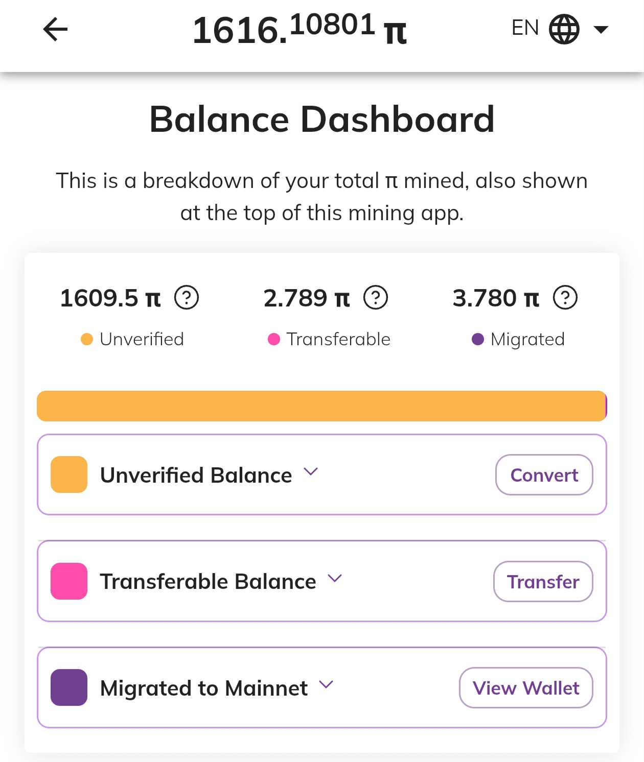 "Pi non vérifié" : Cette section consiste en tous les Pi bonus que vous avez accumulés grâce aux membres de votre cercle de sécurité (à la fois KYC et non-KYC), aux références (à la fois KYC et non-KYC), au bonus d'utilité, et enfin, au bonus de nœud.
