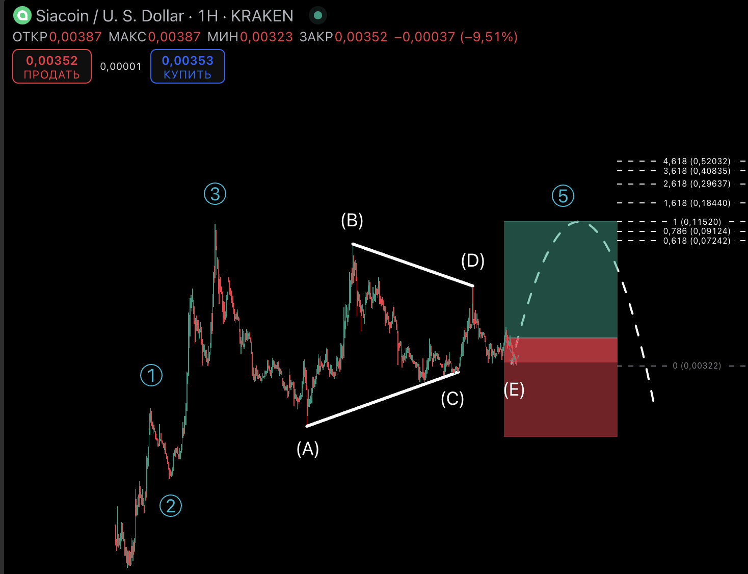 Sur le graphique SC/USD (1H), j'observe la fin de la vague corrective (4) dans une structure impulsionnelle en cinq vagues d'Elliott. La correction s'est développée sous la forme ABCDE (triangle contractant), qui précède souvent une forte rupture.