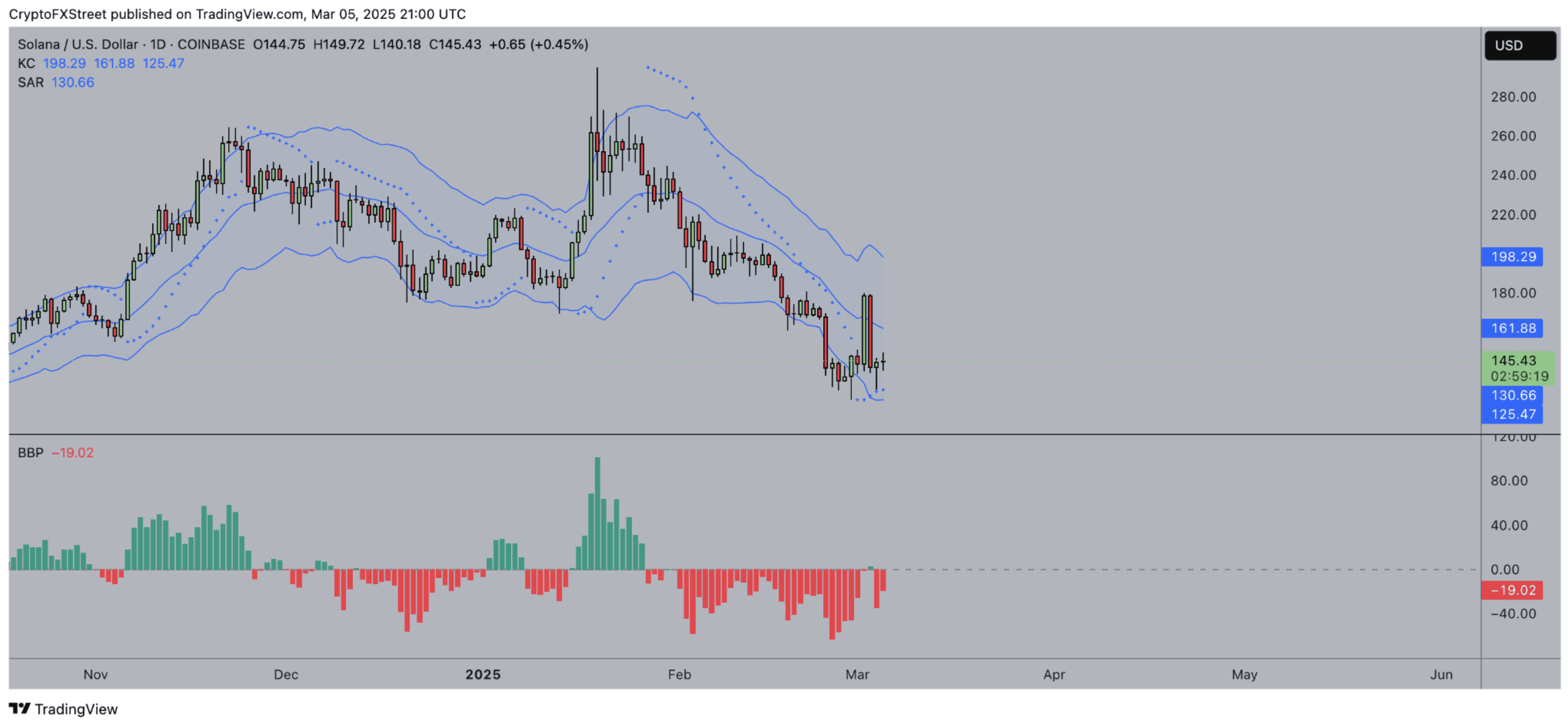 Le canal Keltner (KC) suggère que SOL reste dans une tendance baissière, avec la ligne médiane à 161,88 $ agissant comme une résistance immédiate.