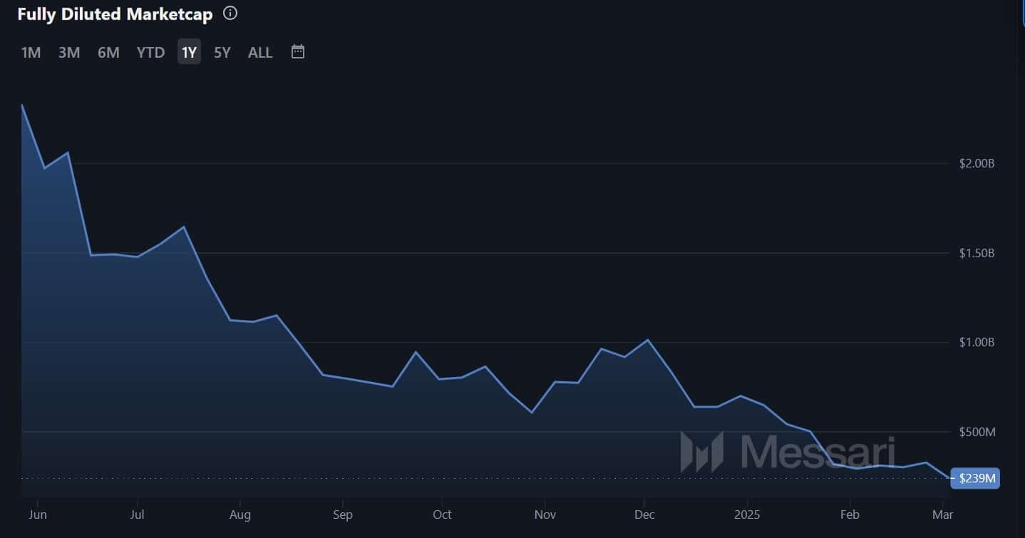 Alors que les détenteurs de Notcoin subissent des pertes majeures, l'analyse indique que le sentiment du marché reste fortement baissier. Le jeton a connu une baisse de la demande, avec des vendeurs dominant le marché. De plus, la capitalisation boursière entièrement diluée de Notcoin est tombée à un niveau historiquement bas, suggérant des ventes significatives et un manque de nouveaux acheteurs entrant sur le marché.