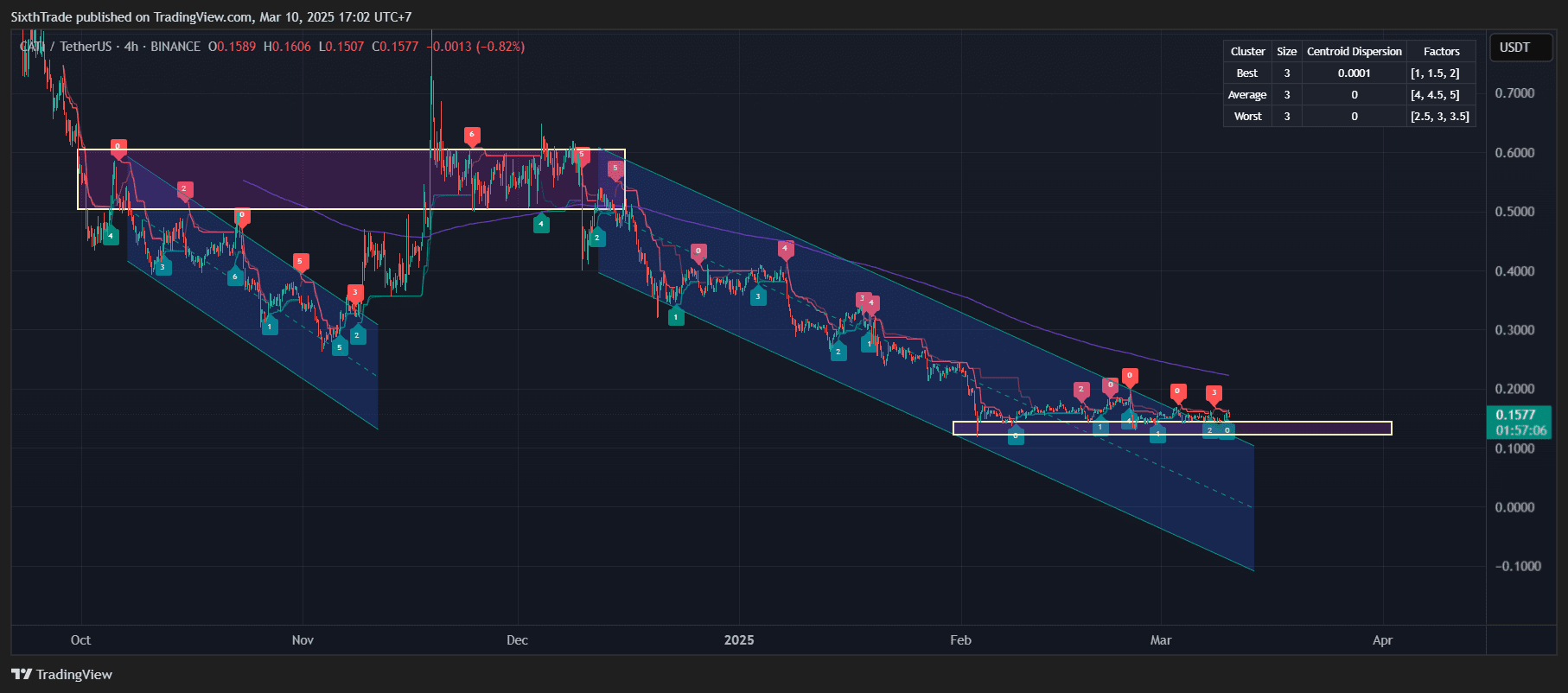 En conclusion, CATIUSDT est dans une tendance à la baisse, avec un RSI neutre suggérant qu'il n'y a pas de conditions de surachat ou de survente immédiates. Le prix est autour de 0,1578, avec une résistance à 0,1606. Une poursuite de la tendance à la baisse pourrait être attendue à moins qu'il y ait une augmentation du volume d'achats ou un catalyseur de marché.