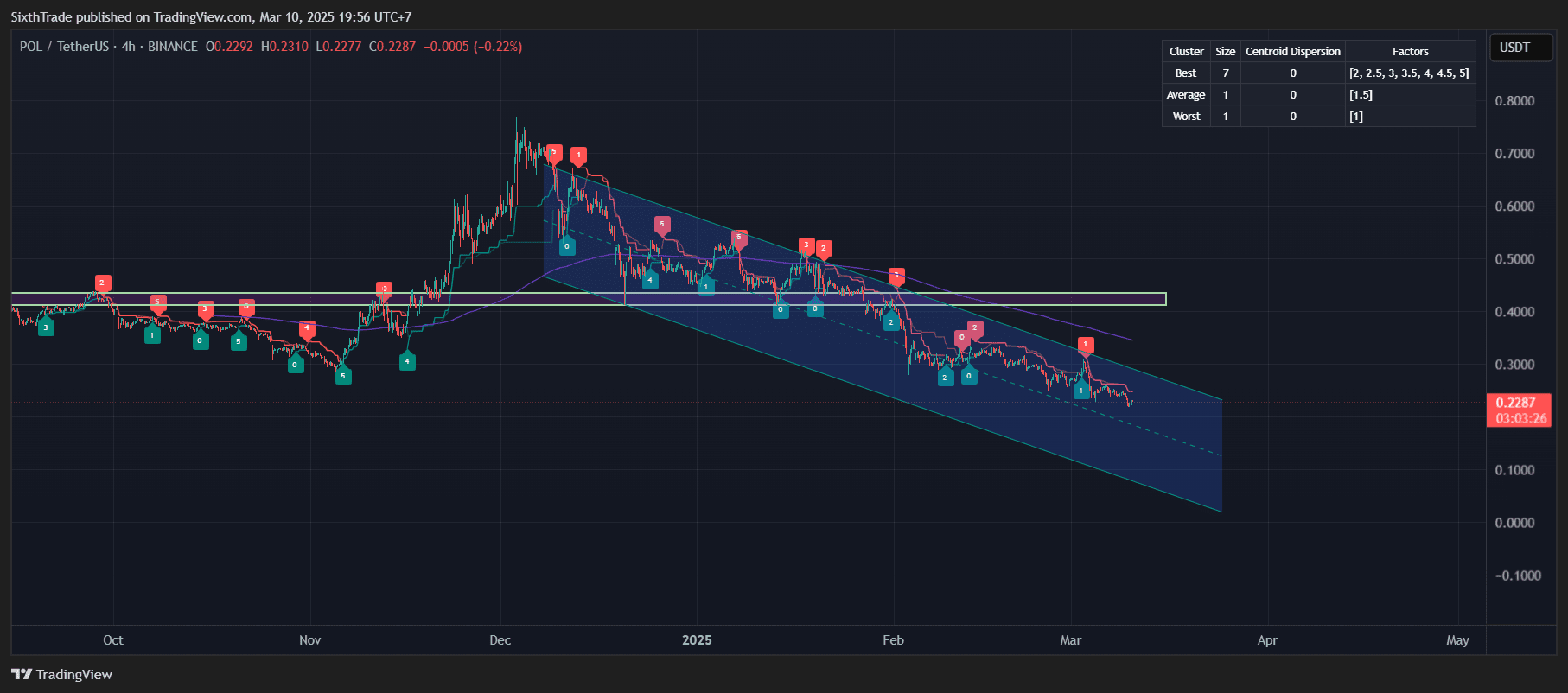 Le support immédiat pour POLUSDT est à 0.2287, le prix testant actuellement ce niveau. Si ce support échoue, la prochaine zone de support se situe autour de 0.22. À la hausse, la résistance est située autour de 0.29, et une rupture au-dessus de ce niveau pourrait signaler une potentielle inversion de tendance.