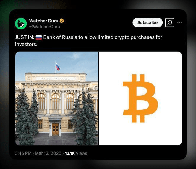 🔵 La Banque de Russie a proposé un régime juridique expérimental de 3 ans, permettant à un nombre limité d'investisseurs de négocier des crypto-actifs.