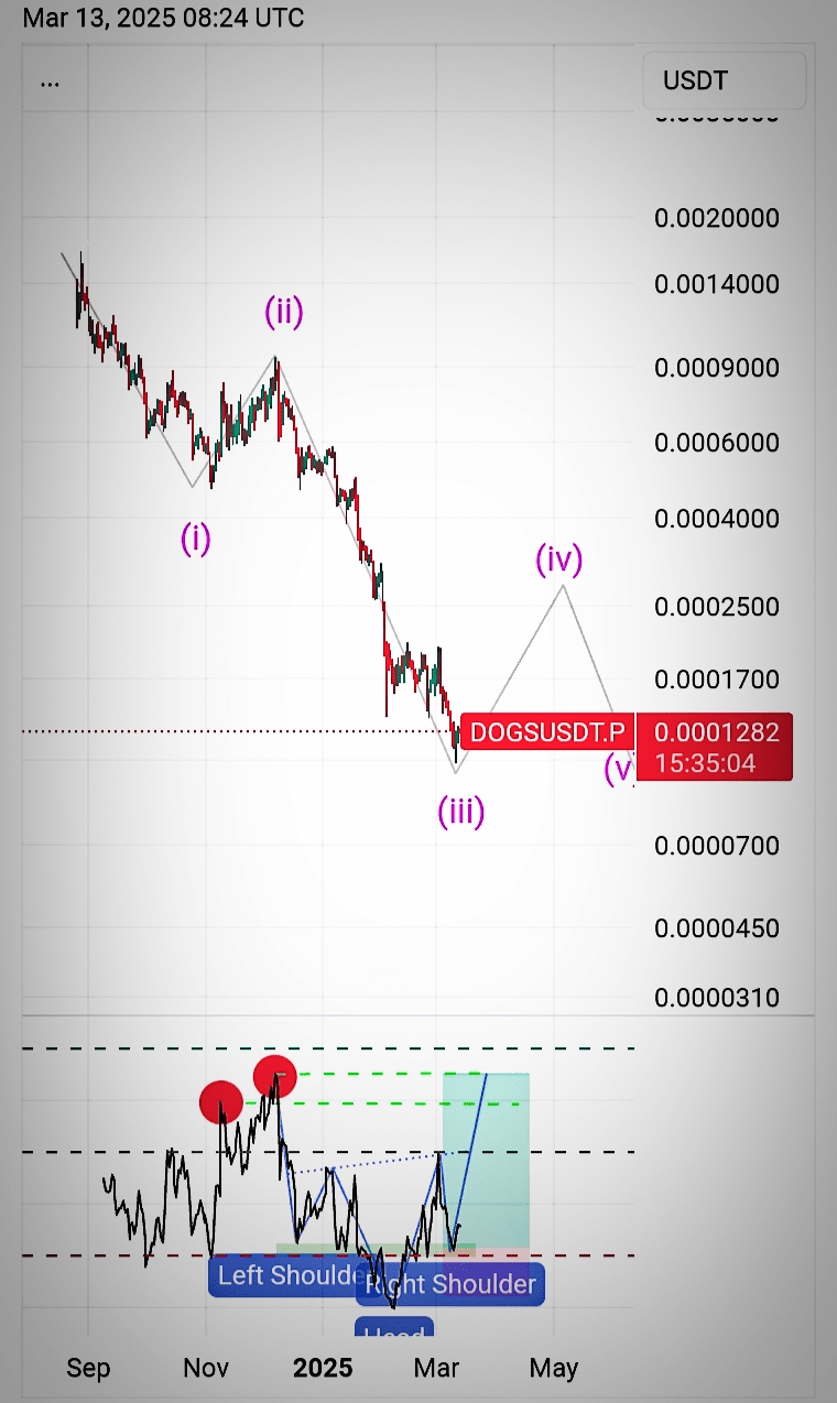 Retracement : La correction de la vague (iv) pourrait s'aligner avec la cassure de l'Inverse TĂȘte et Ăpaules, ciblant 0.00017-0.00025 USDT.