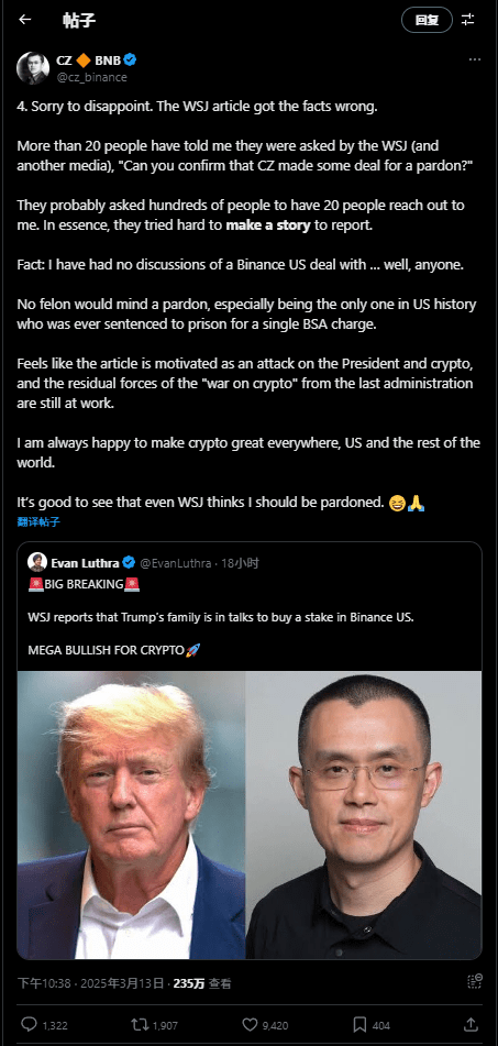 Cependant, le fondateur de Binance, CZ (Zhao Changpeng), a rapidement tweeté pour démentir, affirmant que cette information était « 100 % fausse ». Il a déclaré qu'hier matin, plus de 20 personnes lui avaient demandé si la famille Trump voulait acheter des actions de Binance.US. CZ a clairement indiqué qu'il n'avait jamais discuté d'un accord ou d'une vente de Binance.US avec quiconque.