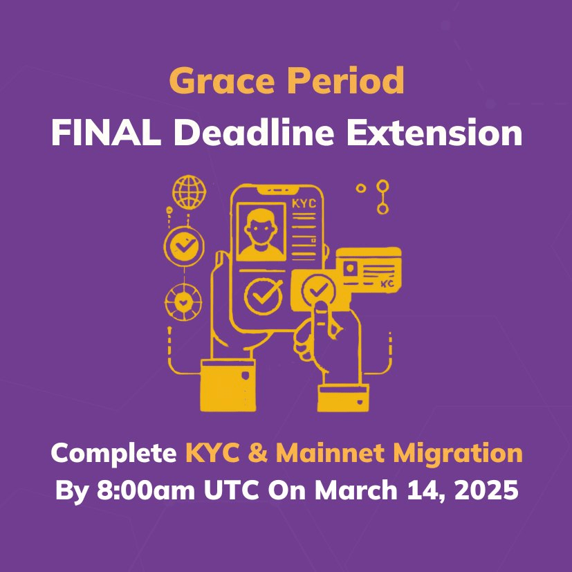La période de grâce se termine bientôt, et la date limite du 14 mars est votre dernière chance de garantir que vous ne perdiez pas la plupart de votre Pi. Il est temps de finir le KYC ✅ et de migrer vers le Mainnet 🌐 avant qu'il ne soit trop tard !