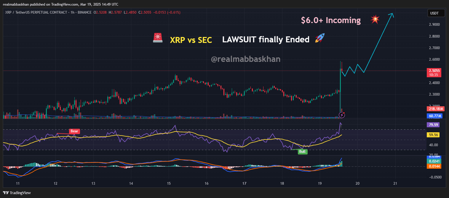—En regardant le graphique XRP/USDT (1H Binance), vous pouvez voir que plus de 218 millions de volume sont entrés dès que la nouvelle de la poursuite a éclaté. Le RSI a grimpé à 79, signalant un fort momentum haussier, tandis que le MACD est devenu vert, confirmant un potentiel d'augmentation supplémentaire. Ce n'est pas juste un petit pump – cela pourrait être le début de la mission tant attendue de la lune de XRP ! 🌕