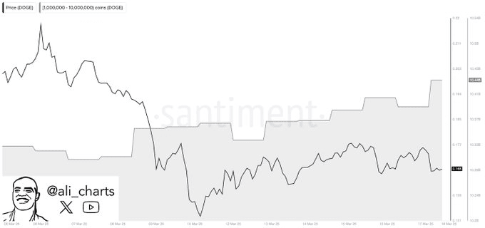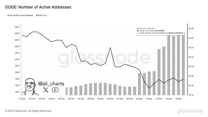 Bien qu'il y ait des signaux baissiers, l'activité du réseau du Dogecoin a augmenté. Selon l'analyste en cryptomonnaie Ali Martinez, le nombre d'adresses actives a considérablement augmenté, passant de 150 000 le 12 mars à plus de 280 000 le 14 mars.