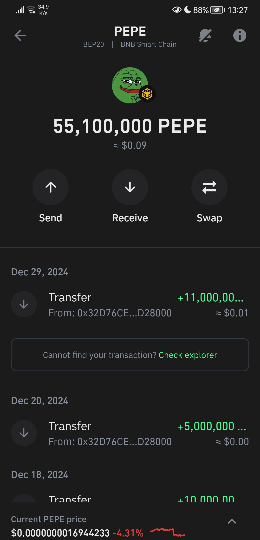 Je détiens 55 millions de PEPE sur TrustWallet, mais voici la partie étrange : son prix est complètement différent du marché principal ! 😨