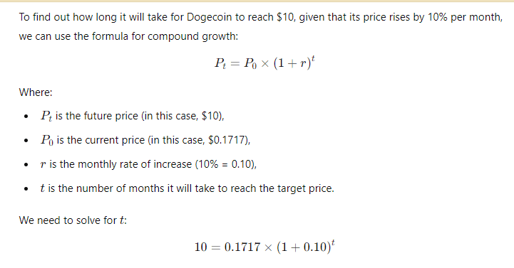 Étant donné le scepticisme actuel autour du potentiel de Dogecoin, examinons de plus près combien de temps il pourrait falloir au meme coin pour atteindre 10 $, en supposant une croissance mensuelle stable de 10 %.