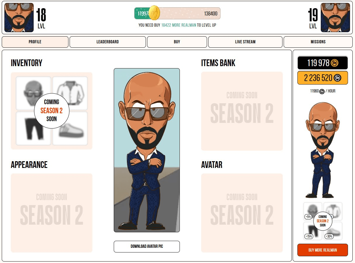 Mon chemin dans #REALMAN se poursuit, et je suis déjà proche du top des participants. Actuellement, je fais monter mon niveau, j'accumule du REALMONEY et je me prépare pour la nouvelle saison, qui promet encore plus d'opportunités pour les participants de la prévente crypto.