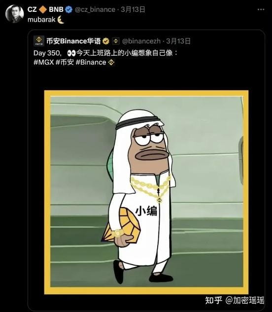 Le 13 mars, le compte Twitter de Binance a publié une image meme d'un "rédacteur" portant une robe arabe.
