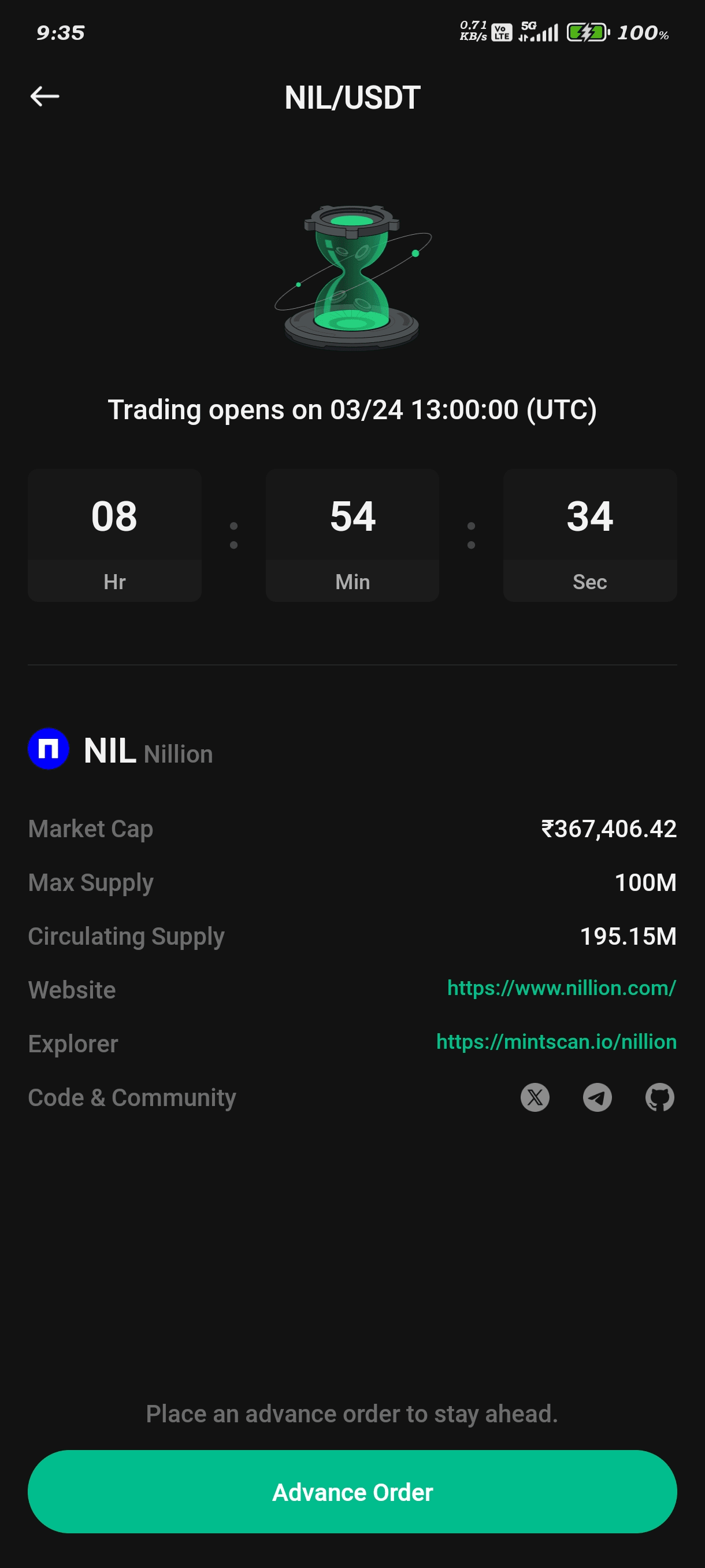 * Le trading s'ouvre dans le futur : L'image indique clairement "Le trading ouvre le 03/24 à 13:00:00 (UTC)". La date et l'heure actuelles selon le contexte sont lundi 24 mars 2025, à 9h43 PST. Cela se traduit par lundi 24 mars 2025, vers 17h13 UTC. L'image indique que le trading ouvrira à 13h00 UTC le même jour. Cela en soi n'est pas nécessairement une arnaque, car les nouvelles inscriptions ont souvent un horaire d'ouverture prévu.