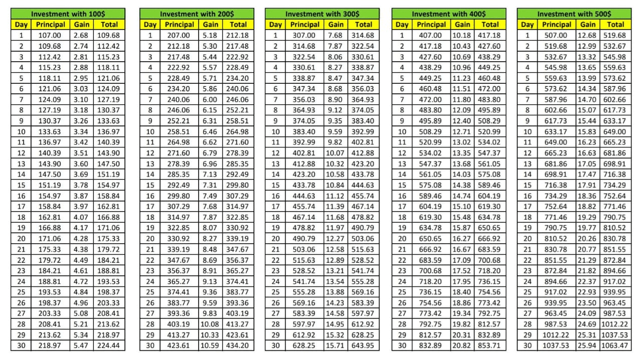 - Jour 1 : Investissez 100 $ → Gagnez 2,68 $ → Total : 109,68 $