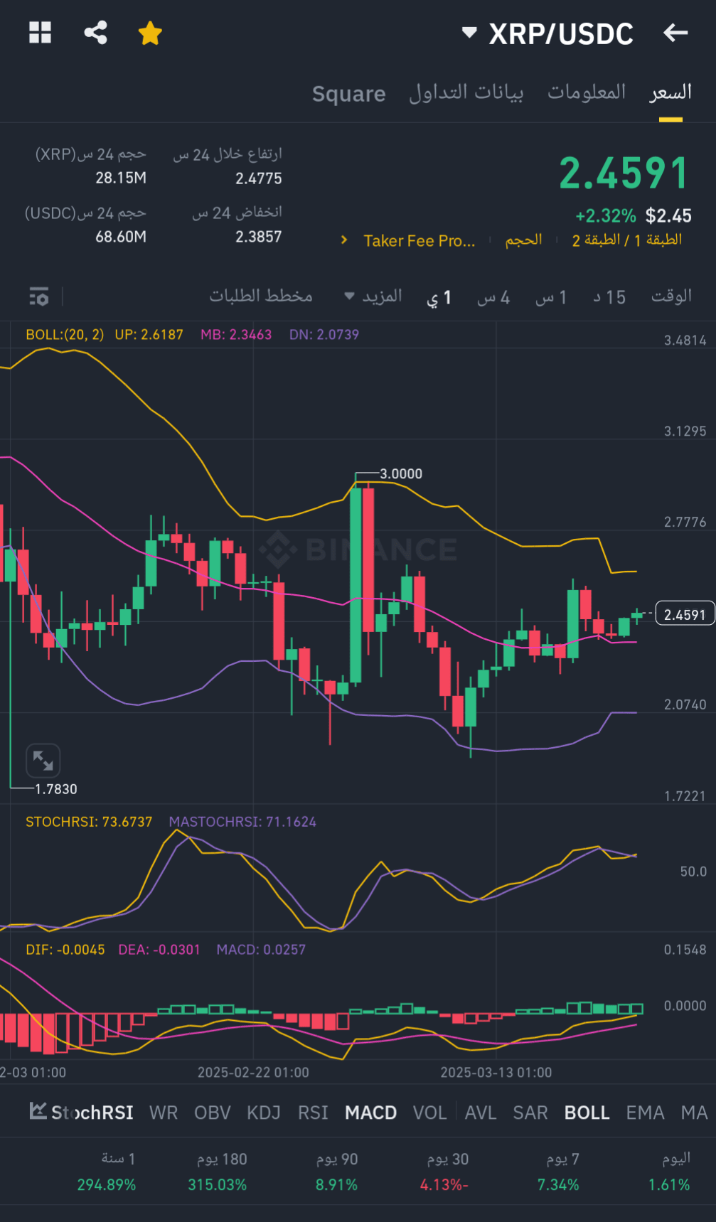 5. Indicateur de force relative stochastique (Stoch RSI) : à 73,67, ce qui signifie que l'actif approche d'une zone de surachat et pourrait subir une correction imminente.