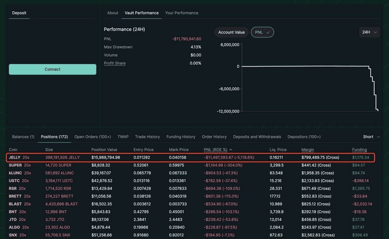 Hyperliquid, une plateforme de contrats à terme perpétuels DeFi, s'est trouvée dans de profonds problèmes après qu'une position courte de 5 millions de dollars sur le memecoin Solana JellyJelly ($JELLY) soit devenue imprévisible en raison d'une liquidation d'un trader. Alors que le prix de $JELLY s'envolait—propulsé par une pression à la hausse et l'engouement des mèmes—les pertes non réalisées d'Hyperliquid ont explosé à 10,63 millions de dollars, avec son coffre de 230 à 240 millions de dollars en danger si les prix atteignaient 0,17 $.