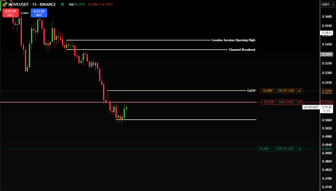 Sur le graphique de 15 minutes, MOVE montre une structure de marché baissière, avec un changement de caractère (ChOCH) confirmant la tendance.